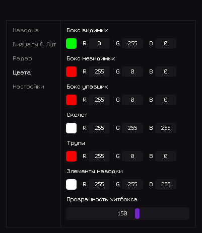 - Бокс видимых – Цвет рамки видимых игроков (RGB).