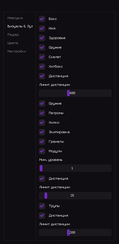 - Лимит дистанции – Радиус ESP предметов (0–1000м).