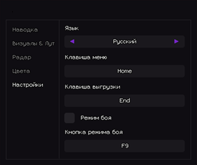 - Клавиша выгрузки – Кнопка полной выгрузки чита из игры.